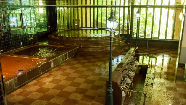 バリエーション豊富なタイル張りのレトロな雰囲気と山中温泉「総湯」と同じ泉質の当館の温泉を愉しみください。