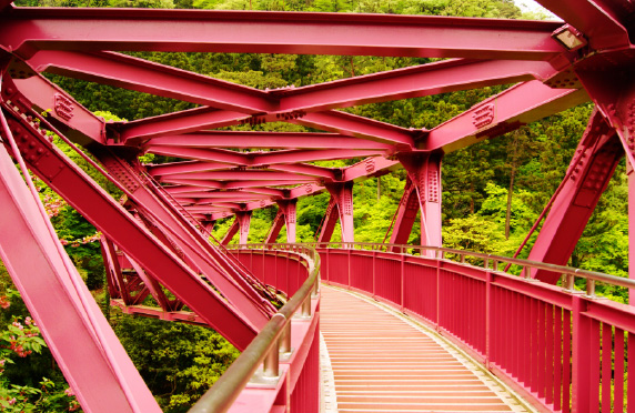 草月流家元・勅使河原宏氏が「鶴仙渓を活ける」というコンセプトのもとでデザインしたユニークなS字型の橋。橋の紅紫色の美しさは四季の風景によって様々な彩りをかもし出します。鶴仙渓遊歩道沿いにあり遠くから見ても楽しめ、橋を渡っている時の眺めも最高です。